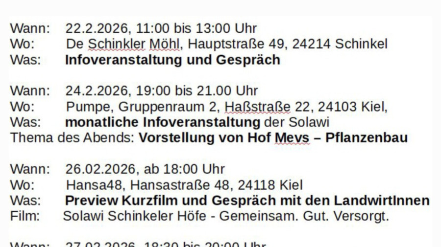 An 5 Info-Abenden stellen sich die Betriebe der „Solawi Schinkeler Höfe“ vor, beantworten Eure Fragen und erklären Euch das Prinzip, wie man in Zeiten des Klimawandels Klasse statt Masse produziert. … Mehr